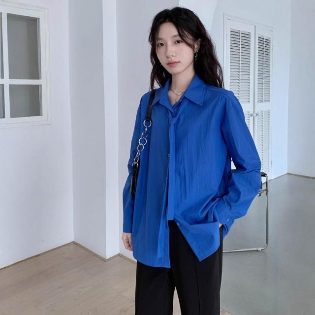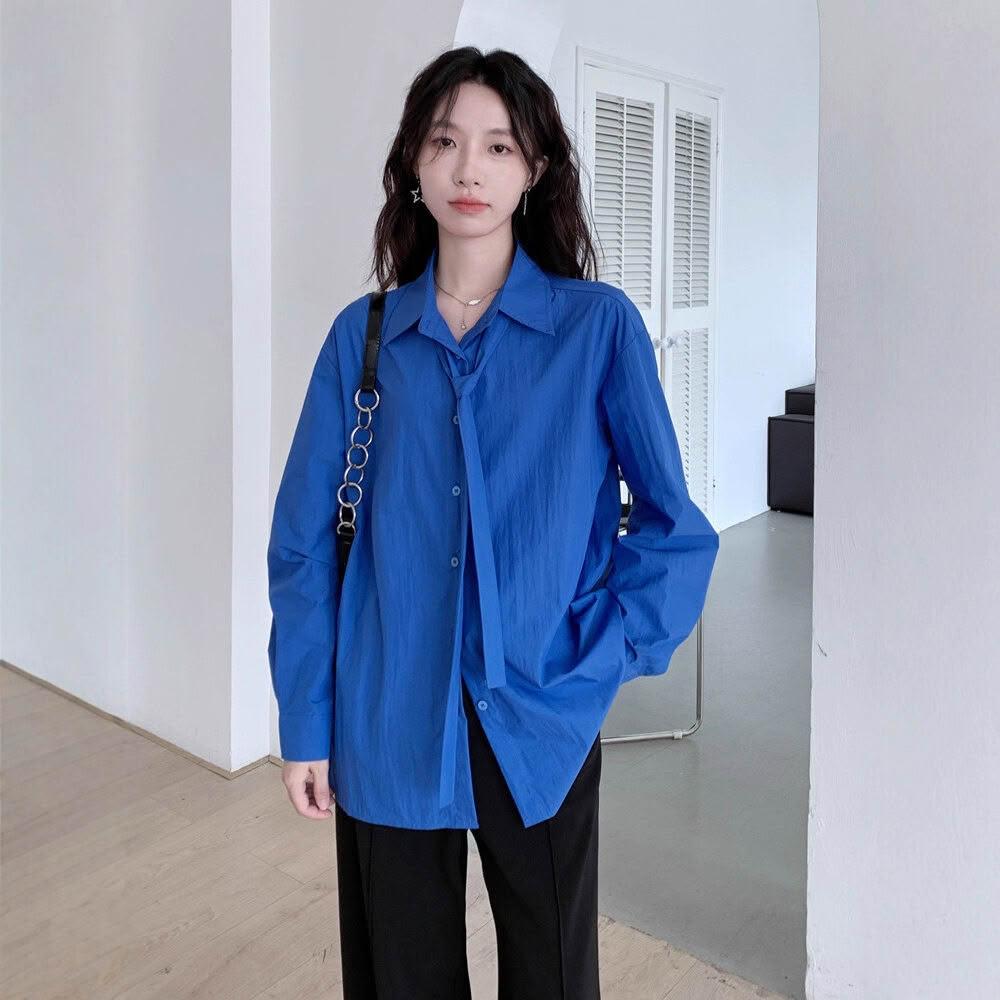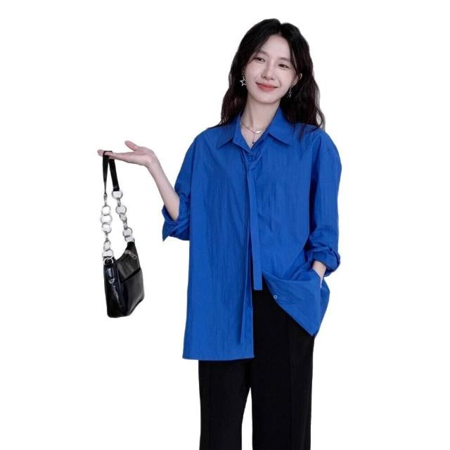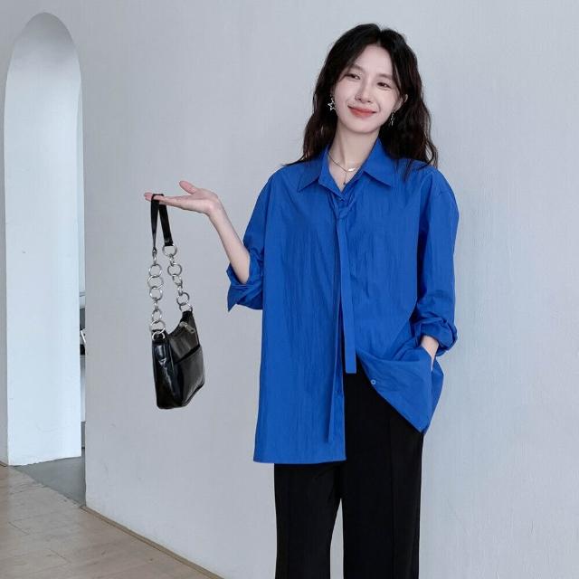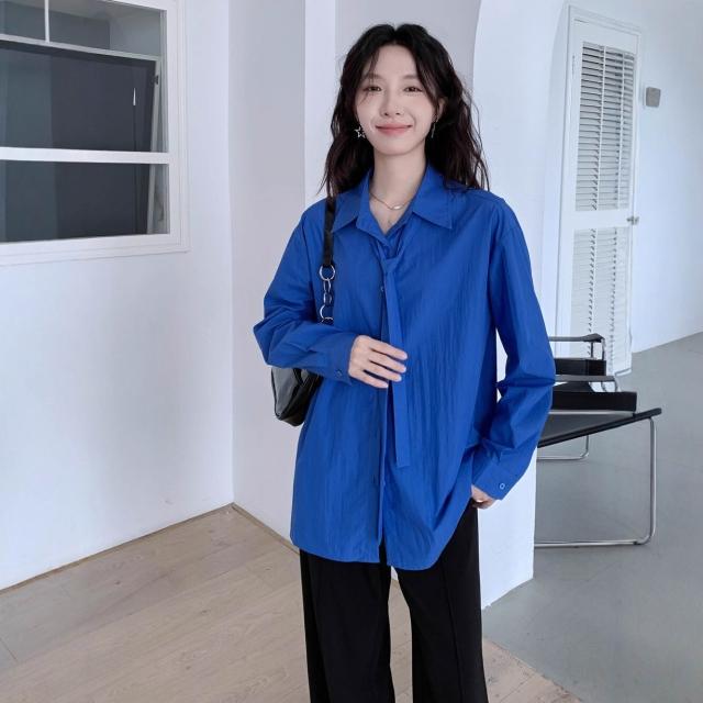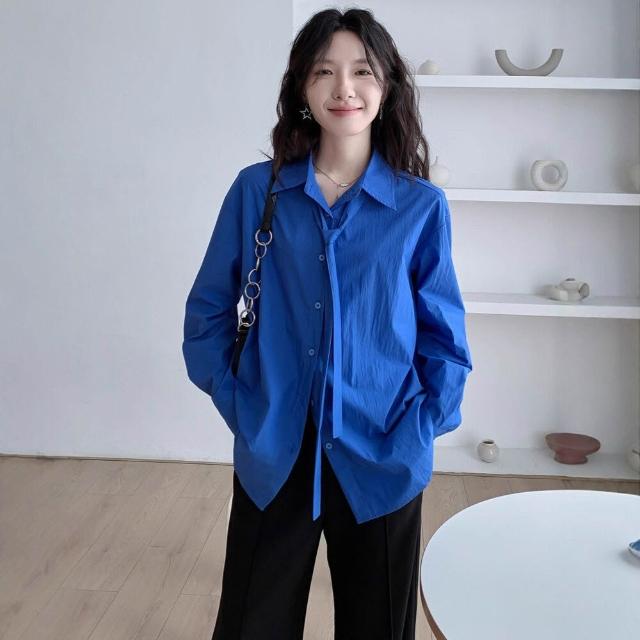 法式克萊因藍長袖襯衫女2025秋季新款寬松系帶設計感小眾襯衣上衣 233