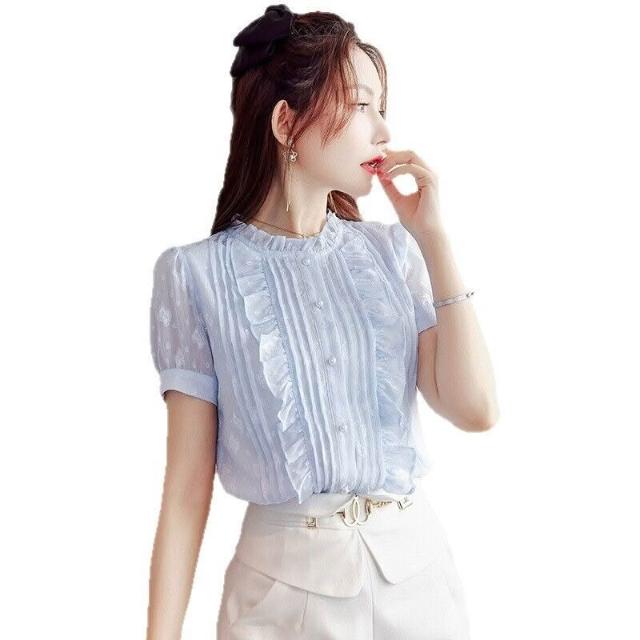 2025圓領荷葉邊短袖雪紡襯衫女夏季新款減齡氣質襯衣顯瘦上衣 421