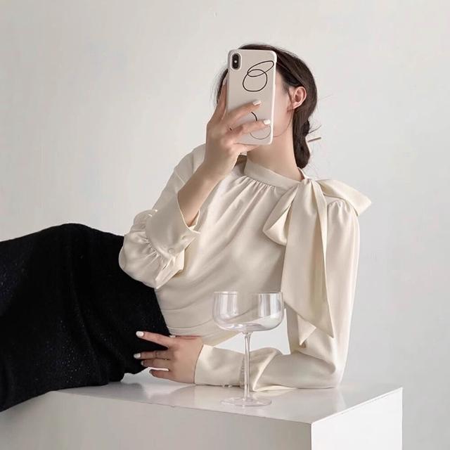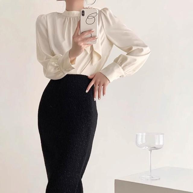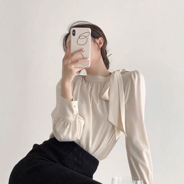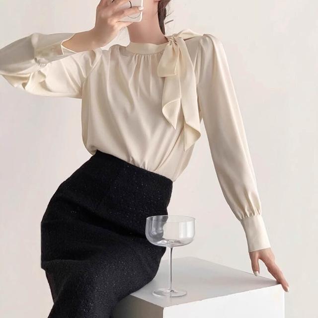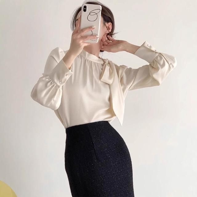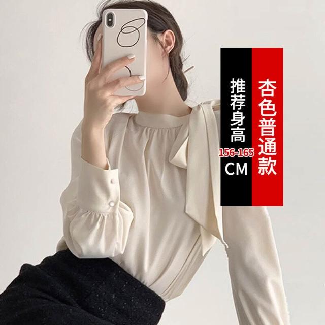 法式醋酸緞面襯衫女春秋內搭泡泡袖襯衣小個子白色蝴蝶結雪紡上衣 87