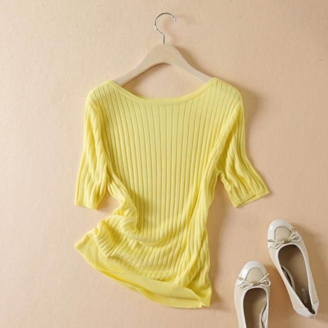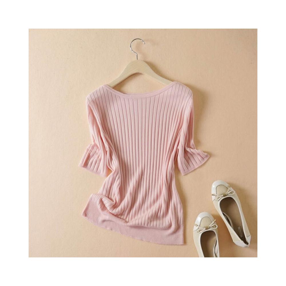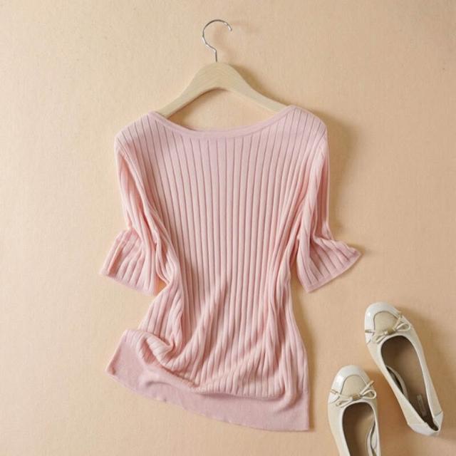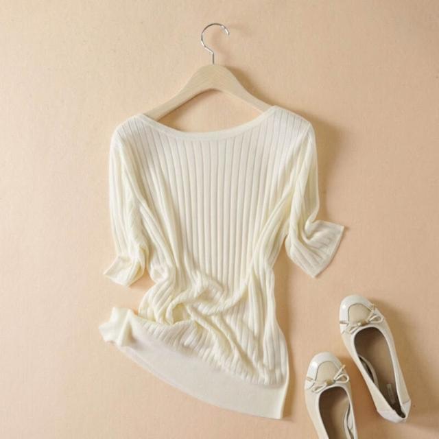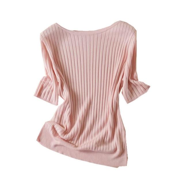 木子家衣櫥 一字領坑條短袖針織套衫2024夏季新款 簡約白搭絹絲薄款打底衫女