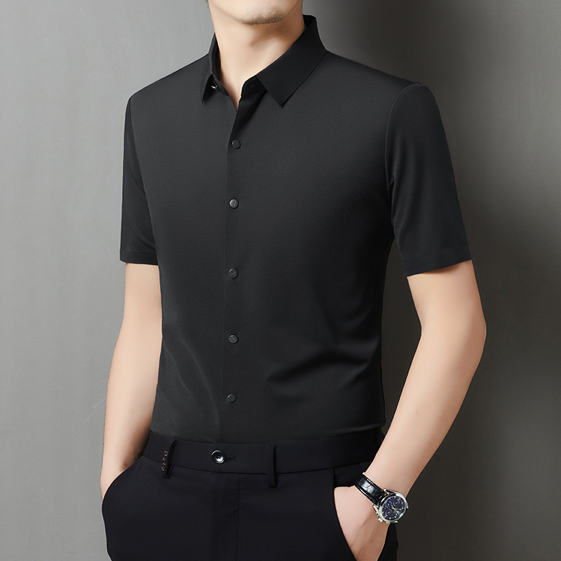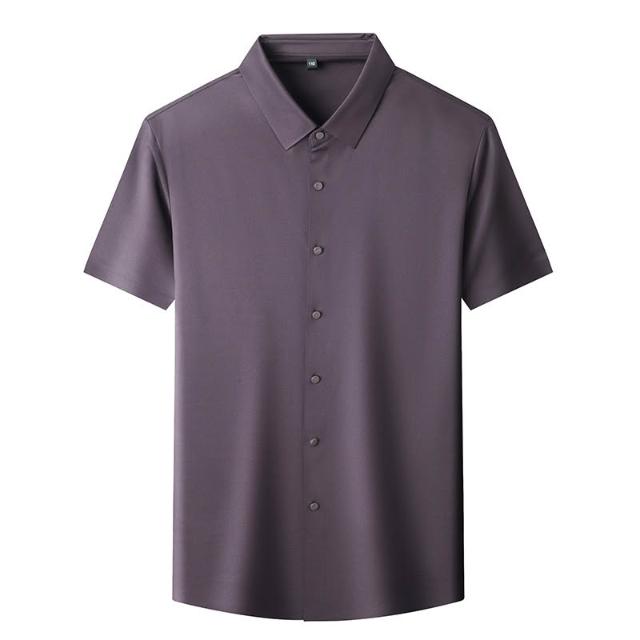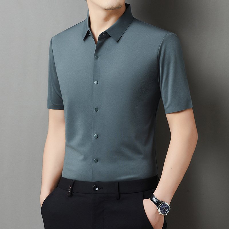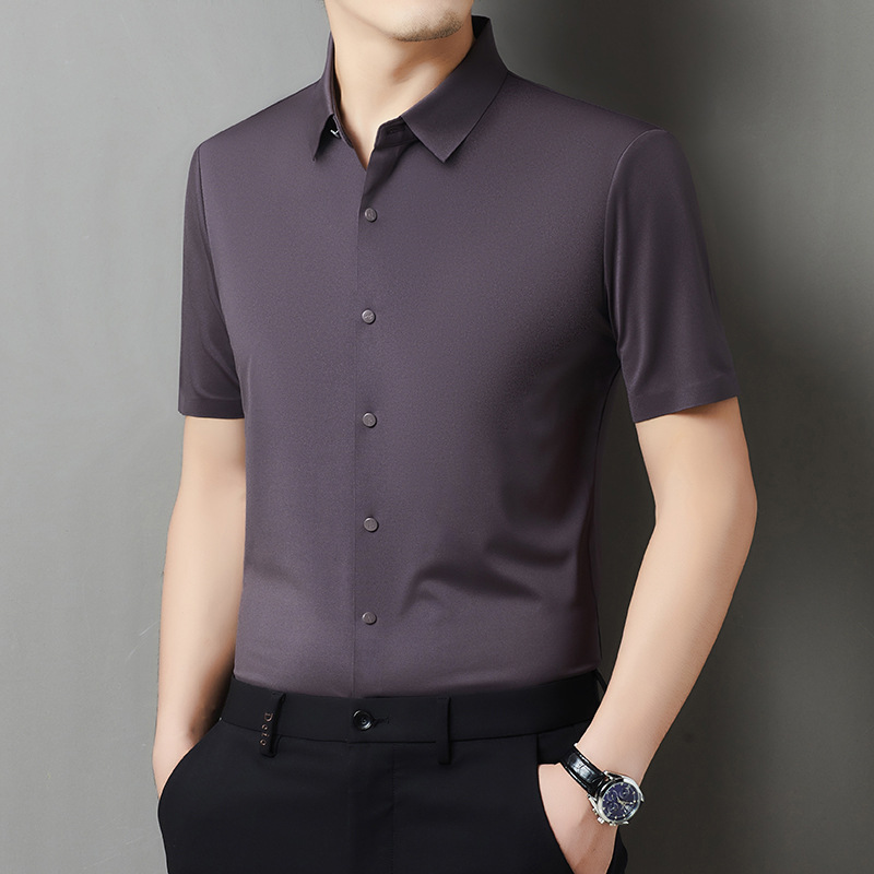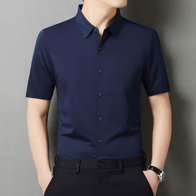 無痕高彈男士輕奢無縫短袖襯衫中年新款免燙商務休閑含桑蠶絲襯衣