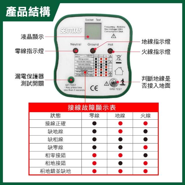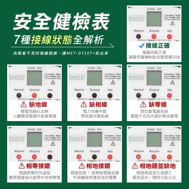 插座安全檢測器 驗電器 漏電跳脫功能 相位檢測 驗房工具 100V~126V 測電壓 漏電保護測試 618-DY207+