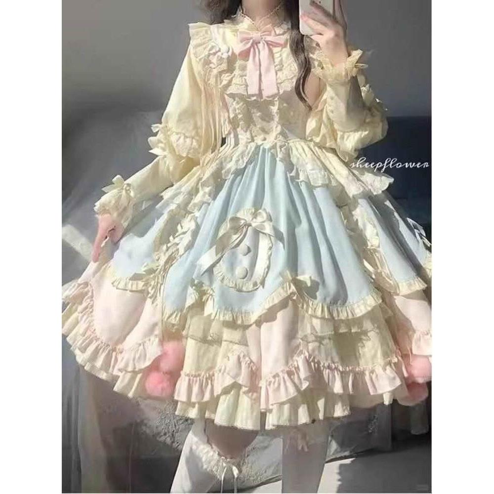 雨墨 秋冬洛麗塔藍粉可愛甜美lolita長袖短款連衣裙OP蓬蓬氣質公主裙子 f83