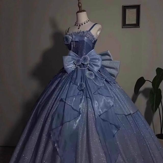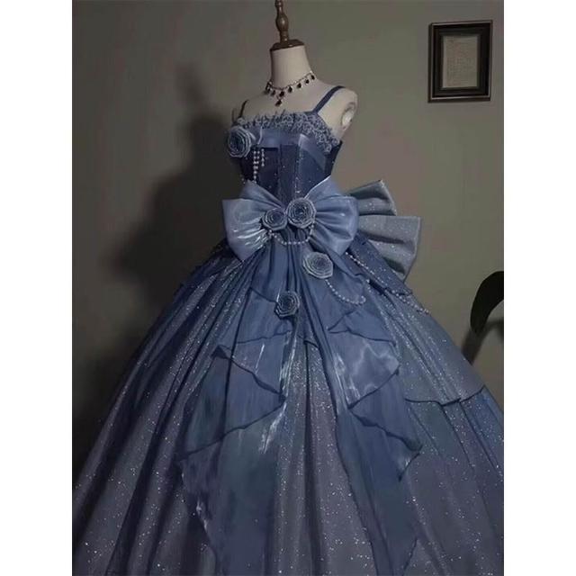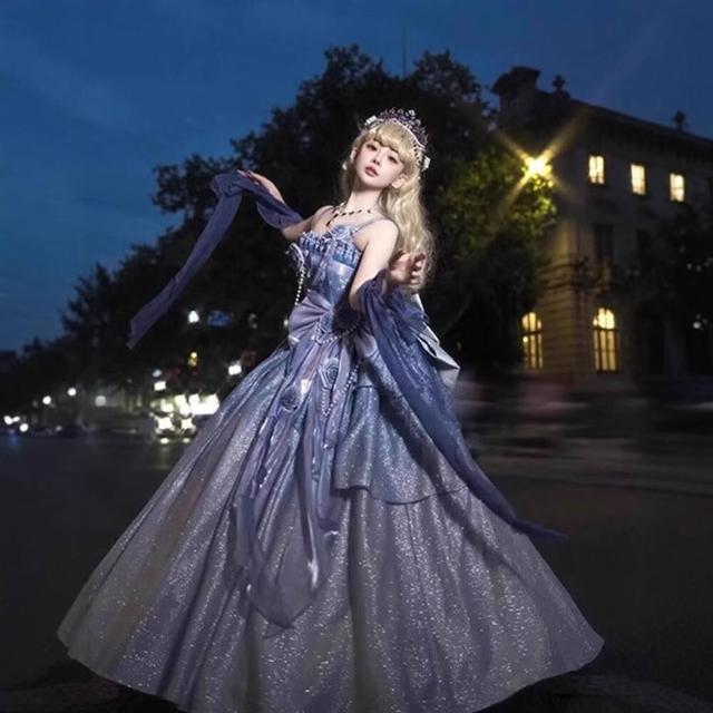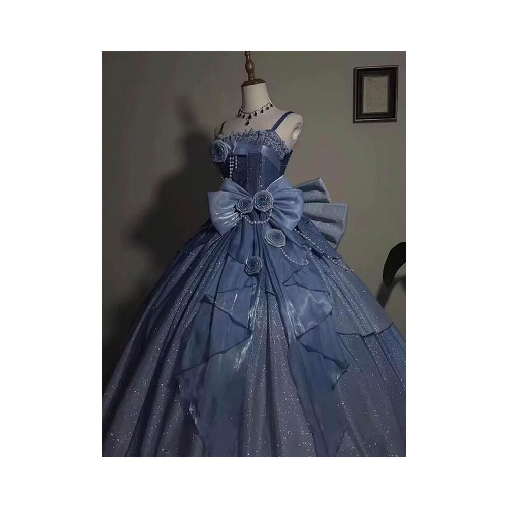 雨墨 優雅藍色花嫁細閃Lolita婚紗禮服連衣裙jsk洛麗塔重工長款連衣裙 ff7