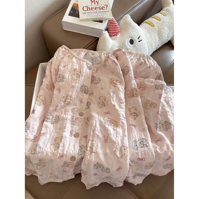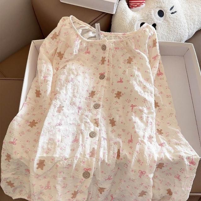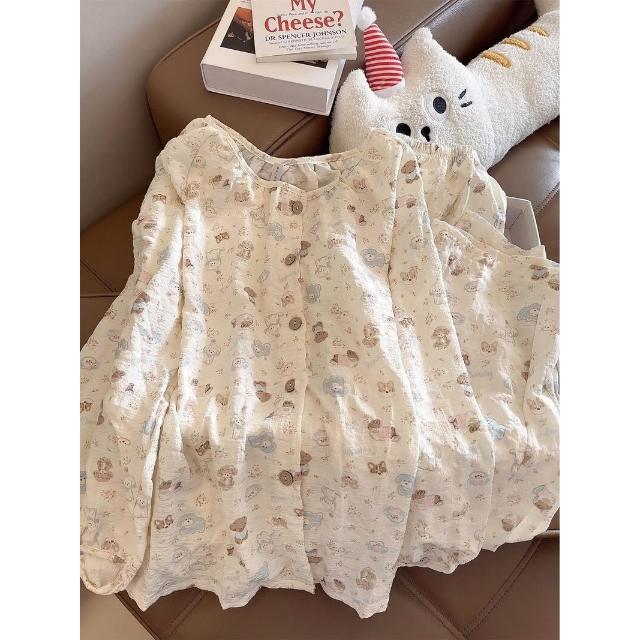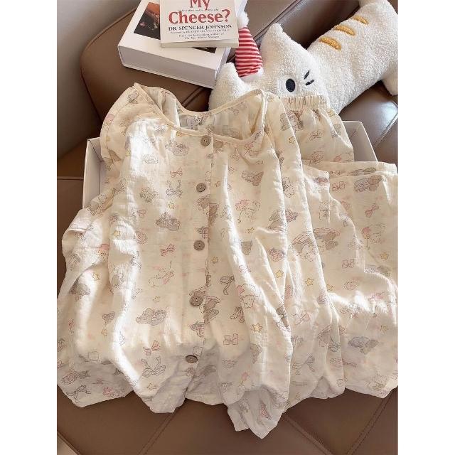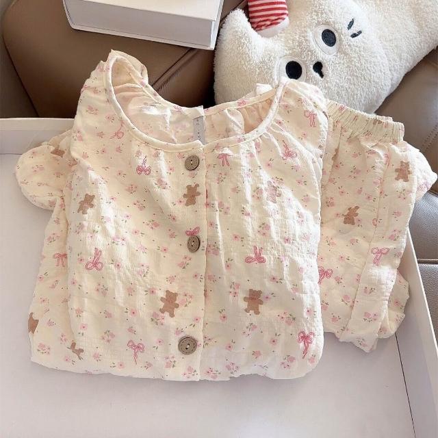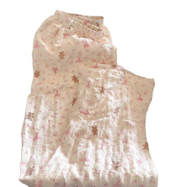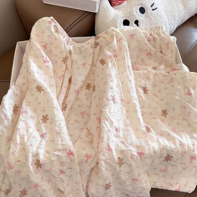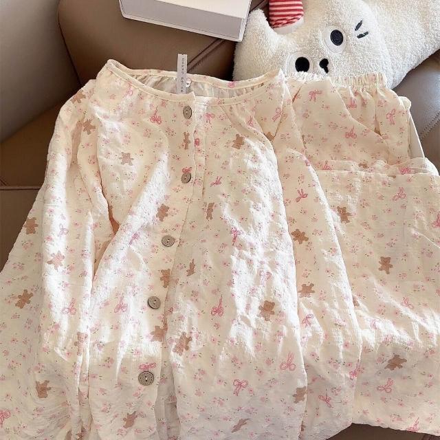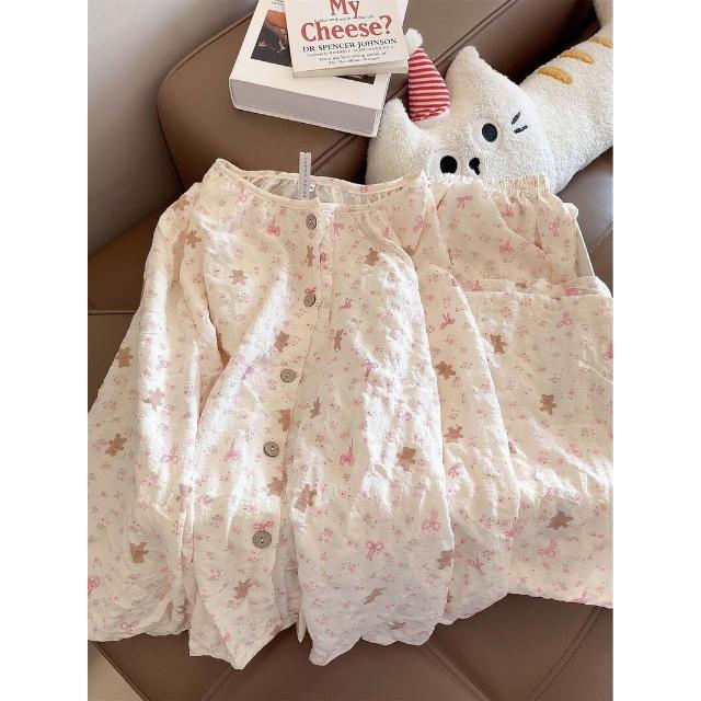 日系ins甜美碎花小熊長袖長褲睡衣女春秋新款泡泡棉帶胸墊家居服 e5c