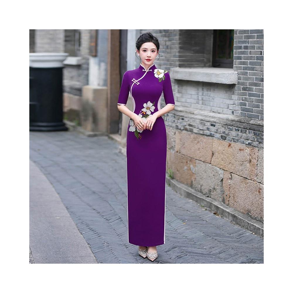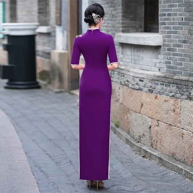 紫色旗袍氣質優雅長款中式立領連衣裙2025新款走秀演出服旗袍禮服 906