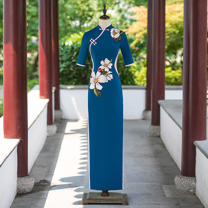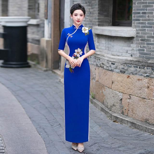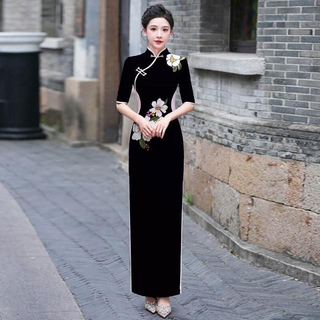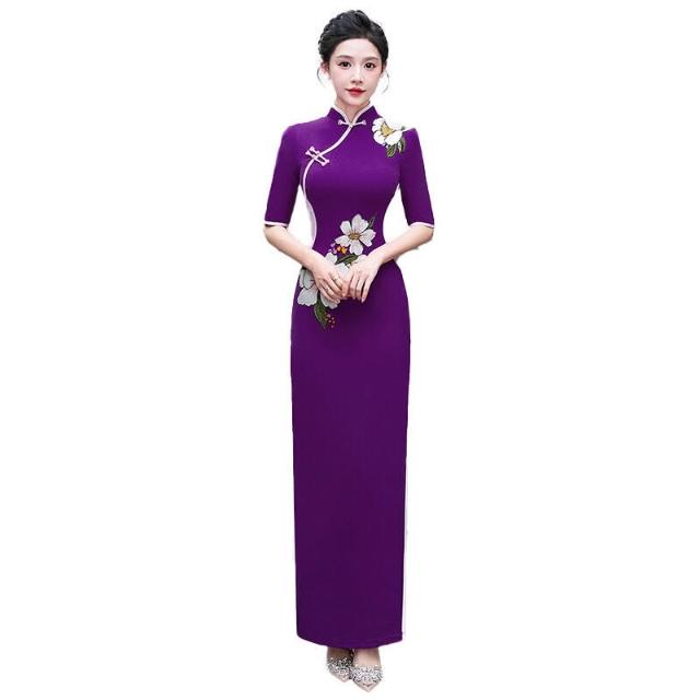 紫色旗袍氣質優雅長款中式立領連衣裙2025新款走秀演出服旗袍禮服 906