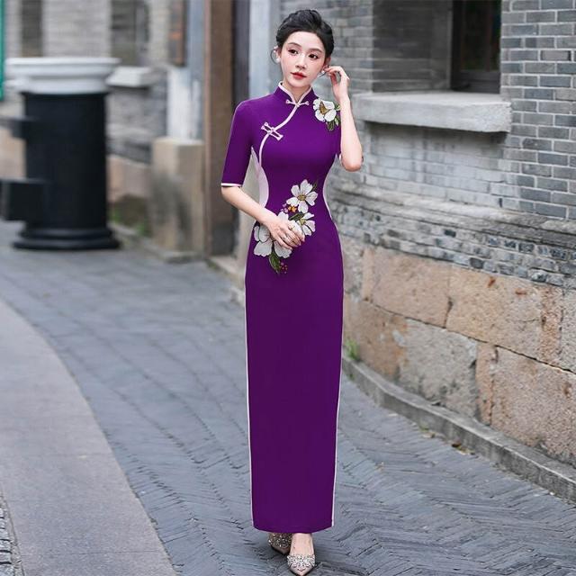 紫色旗袍氣質優雅長款中式立領連衣裙2025新款走秀演出服旗袍禮服 906