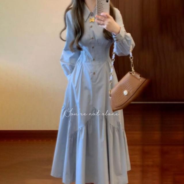 法式學院風藍色POLO領襯衫連衣裙女夏季收腰顯瘦高級感氣質a字裙 59b