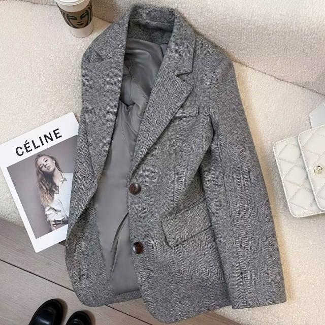 灰色人字紋毛呢西裝外套女2025新款秋冬季小個子復古通勤休閑上衣 a29