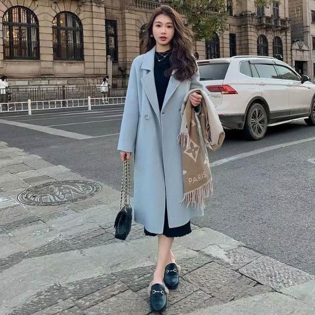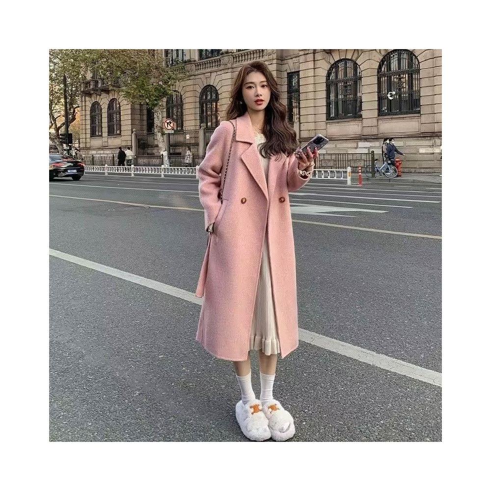 粉色雙面大衣女2025年秋冬新款韓版寬松中長款洋氣系帶毛呢外套 c7f