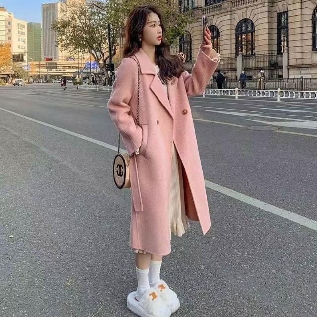 粉色雙面大衣女2025年秋冬新款韓版寬松中長款洋氣系帶毛呢外套 c7f