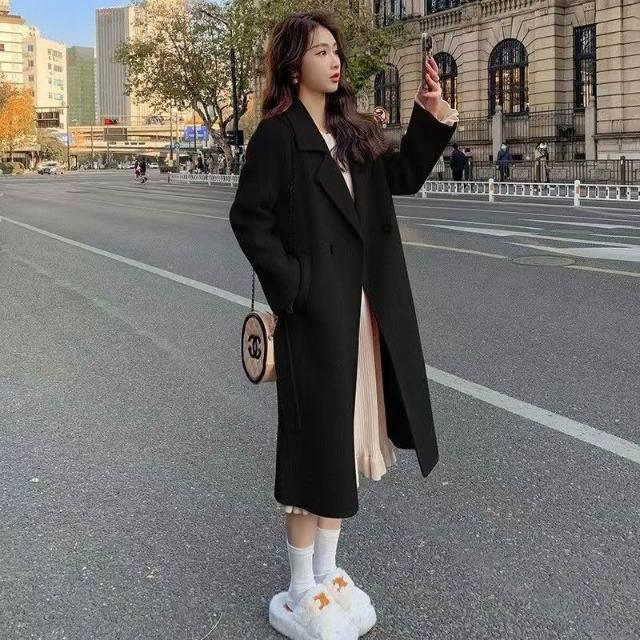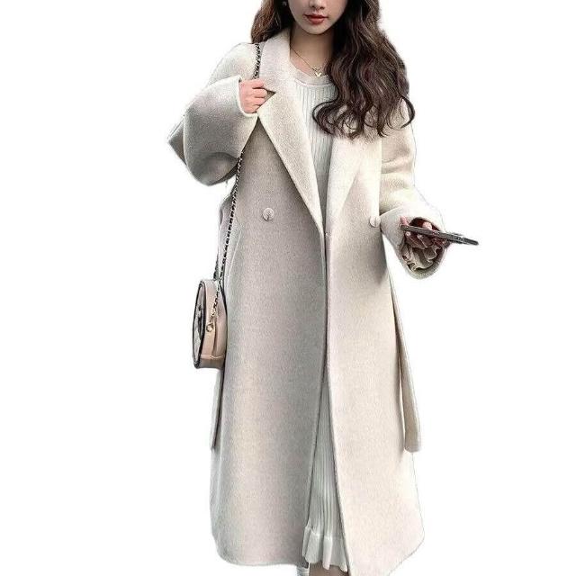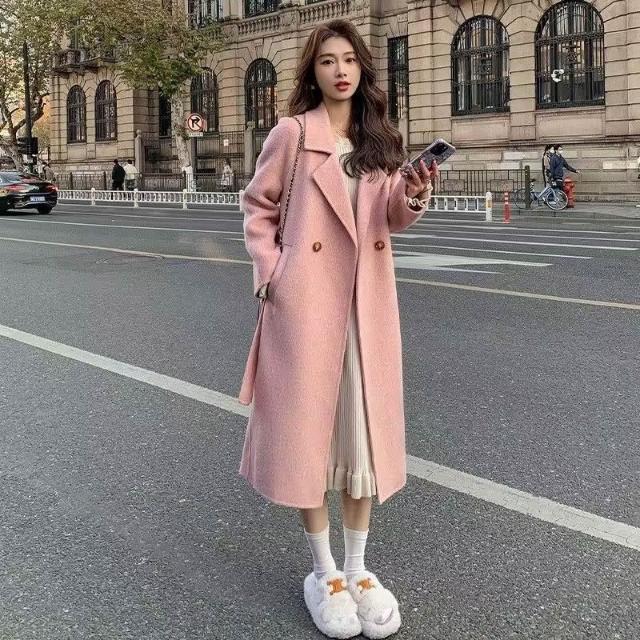 粉色雙面大衣女2025年秋冬新款韓版寬松中長款洋氣系帶毛呢外套 c7f
