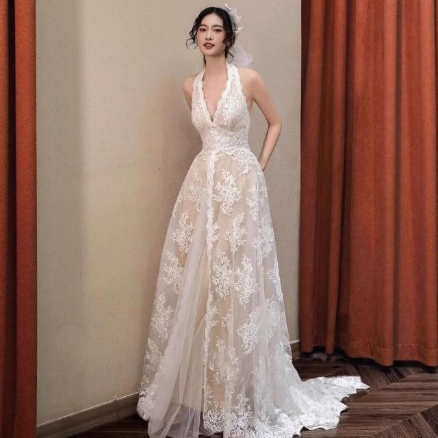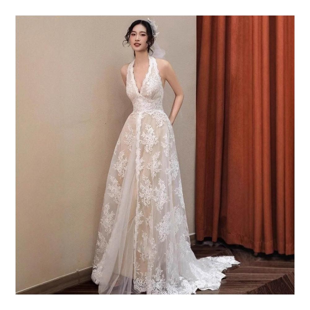 法式復古蕾絲輕婚紗新娘高級感森系出門紗晨袍領掛脖訂婚禮服裙 71e