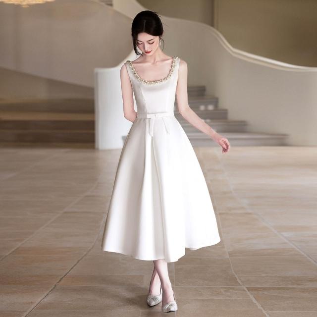 法式訂婚輕紗白色簡約宴會小禮服領證登記日常連衣裙復古晚禮服女 da6