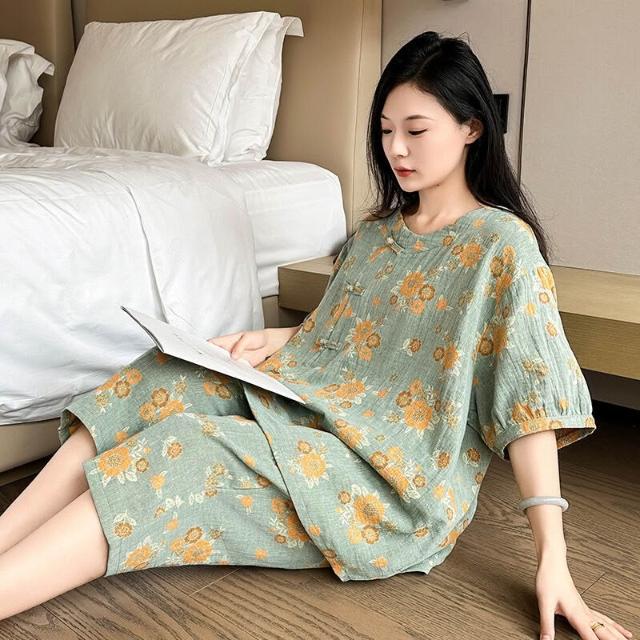 夏季大碼純棉睡衣女士薄款中國風提花紗布套裝胖mm短袖家居服 ebb