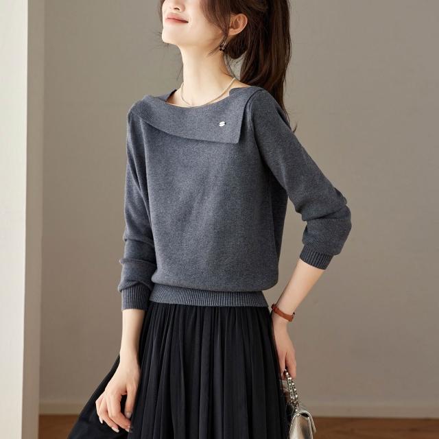復古酒紅一字領針織衫女2025秋季新款氣質顯瘦套頭毛衣打底衫上衣 4b4
