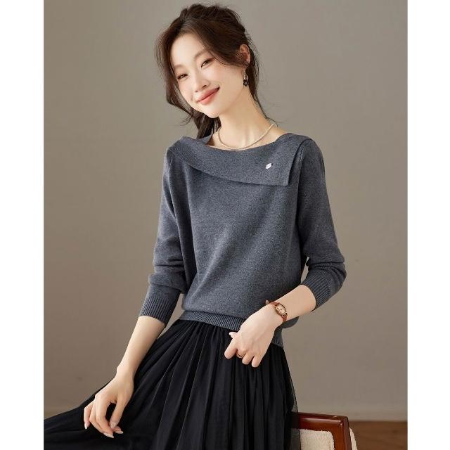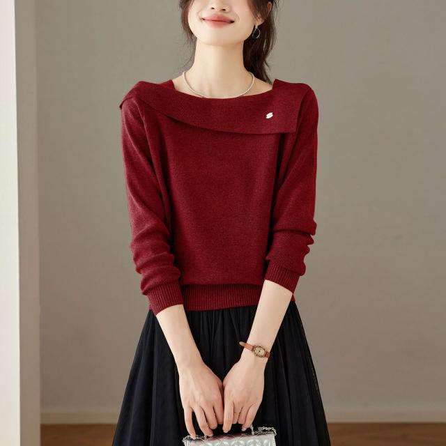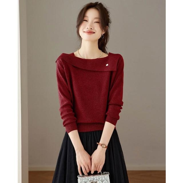 復古酒紅一字領針織衫女2025秋季新款氣質顯瘦套頭毛衣打底衫上衣 4b4