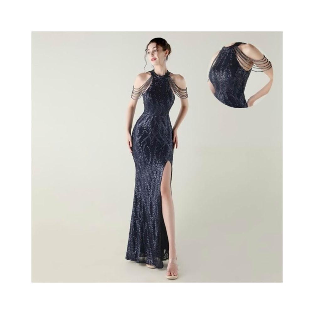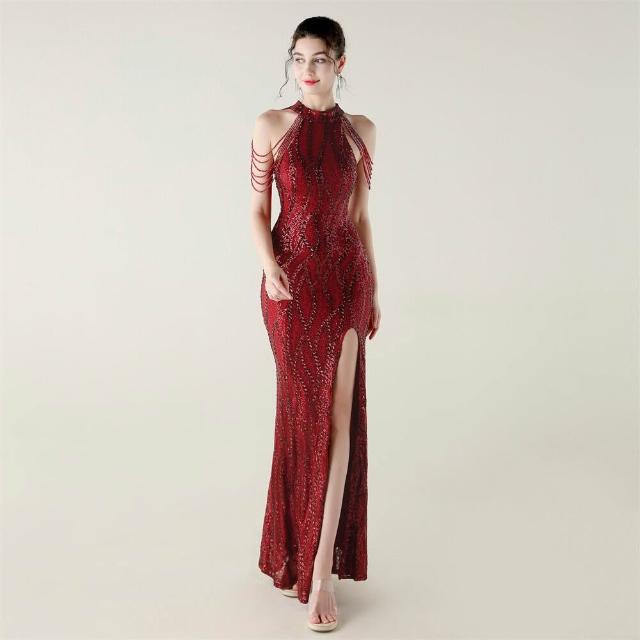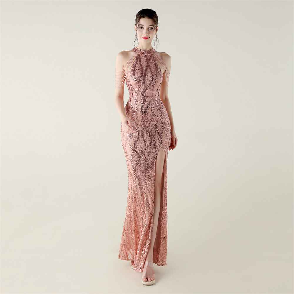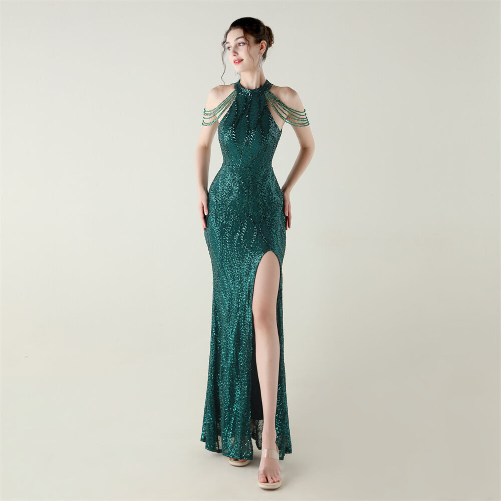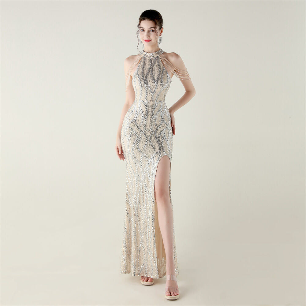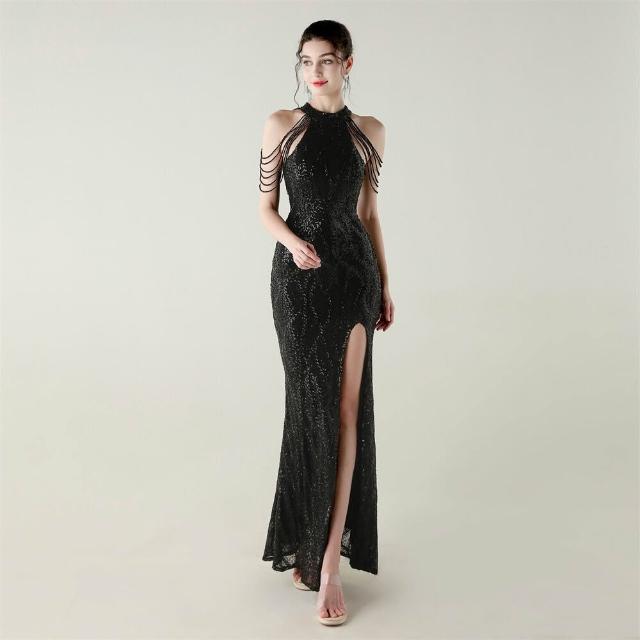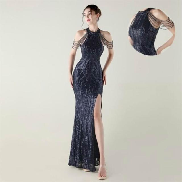 33660#珠片工藝訂珠晚禮服露肩掛脖魚尾裙擺社交名媛風輕奢顯瘦 6c4