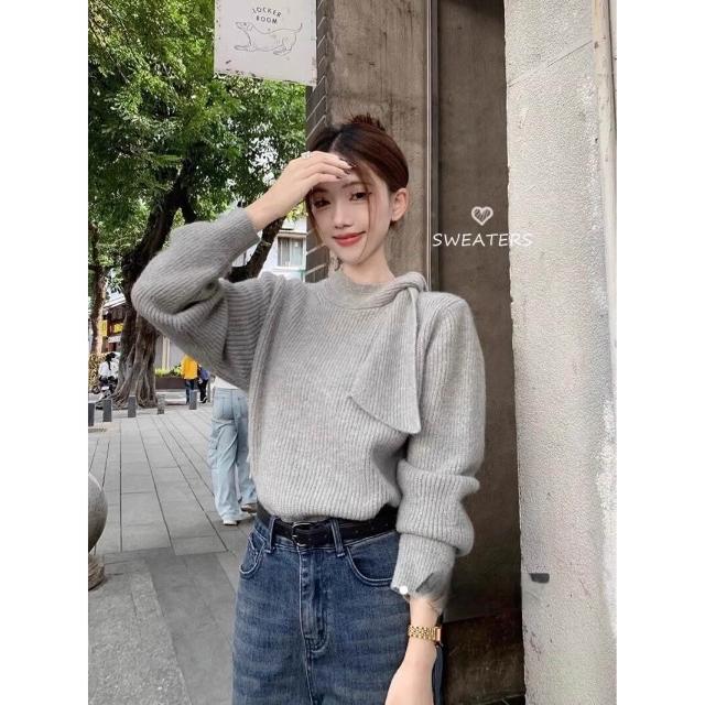 韓系復古溫柔半高領綁帶灰色毛衣女冬季新款慵懶高級感針織衫上衣