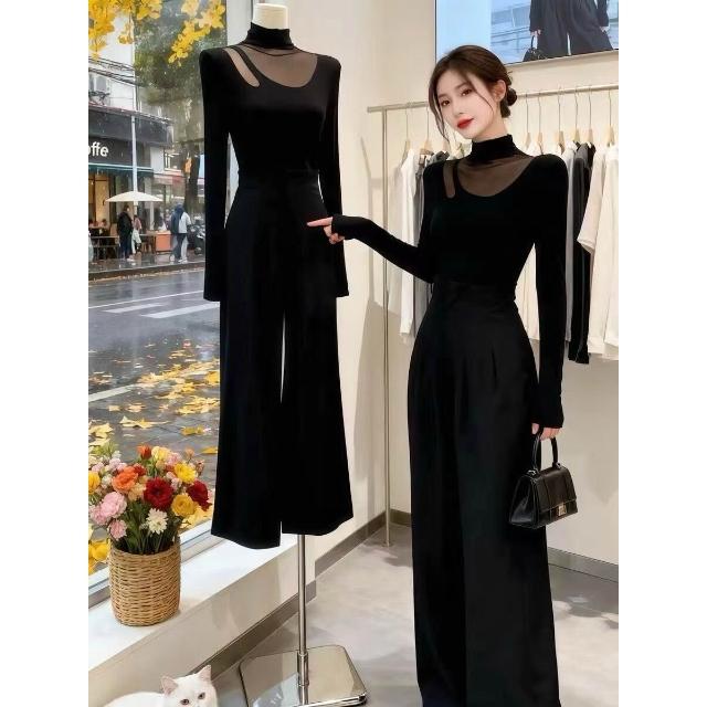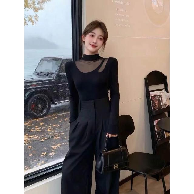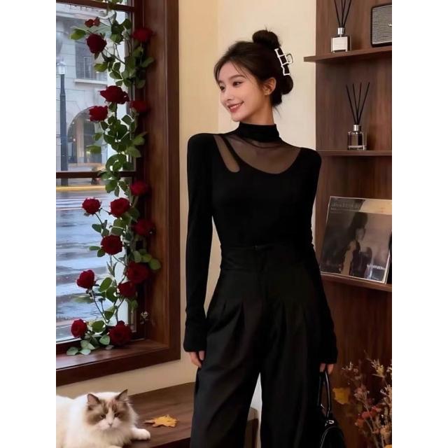 黑色半高領網紗內搭可外穿打底衫女秋冬設計感拼接修身氣質上衣服