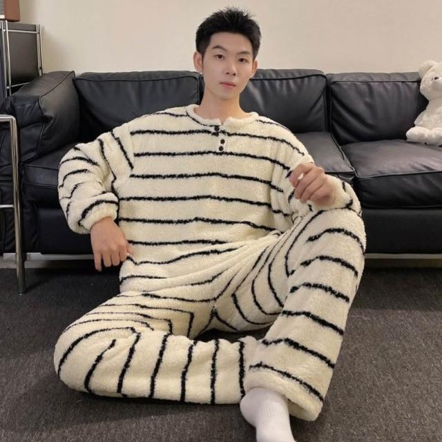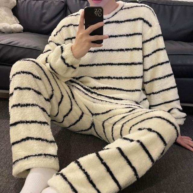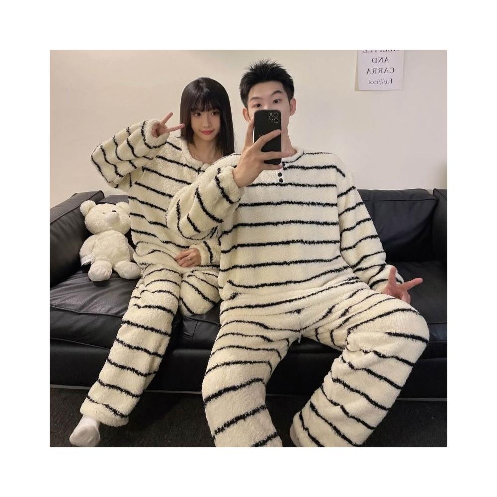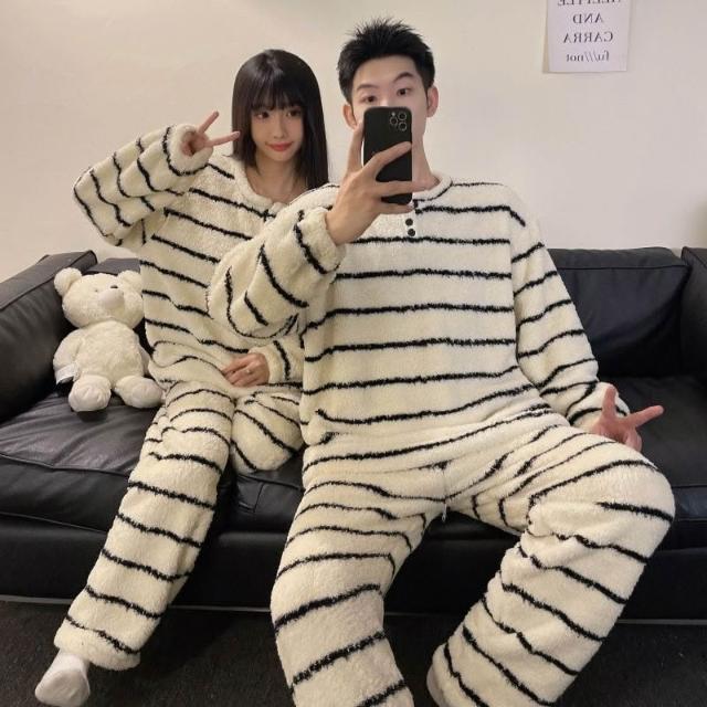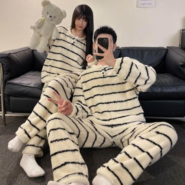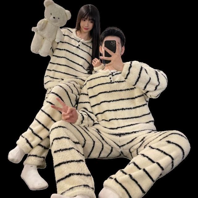 卡馨 新款情侶珊瑚絨睡衣冬季加厚加絨條紋半邊絨套裝 260克