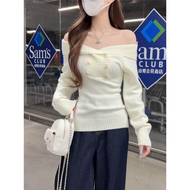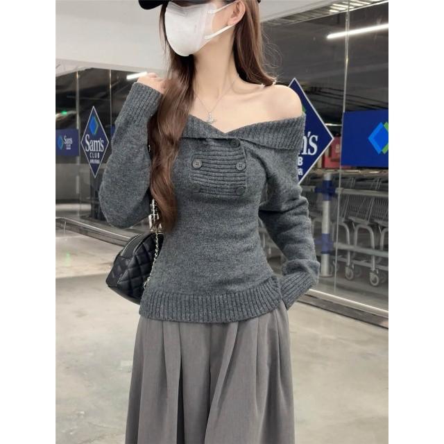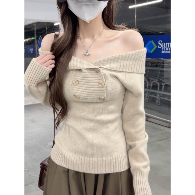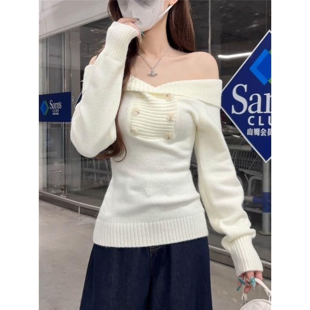 雨墨韓系氣質一字肩羊毛針織衫秋辣妹露肩毛衣上衣
