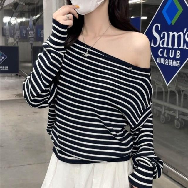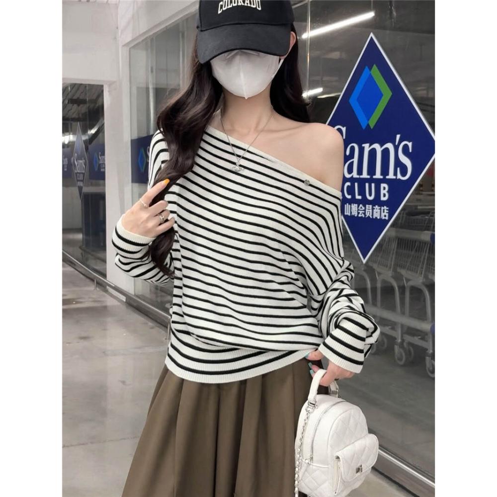 雨墨 條紋針織衫女秋季穿搭辣妹性感露肩一字肩毛衣打底上衣
