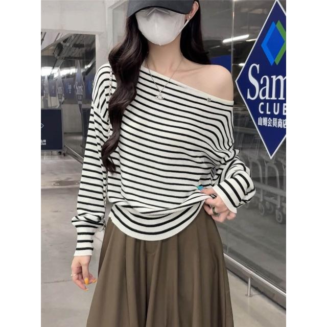 雨墨 條紋針織衫女秋季穿搭辣妹性感露肩一字肩毛衣打底上衣