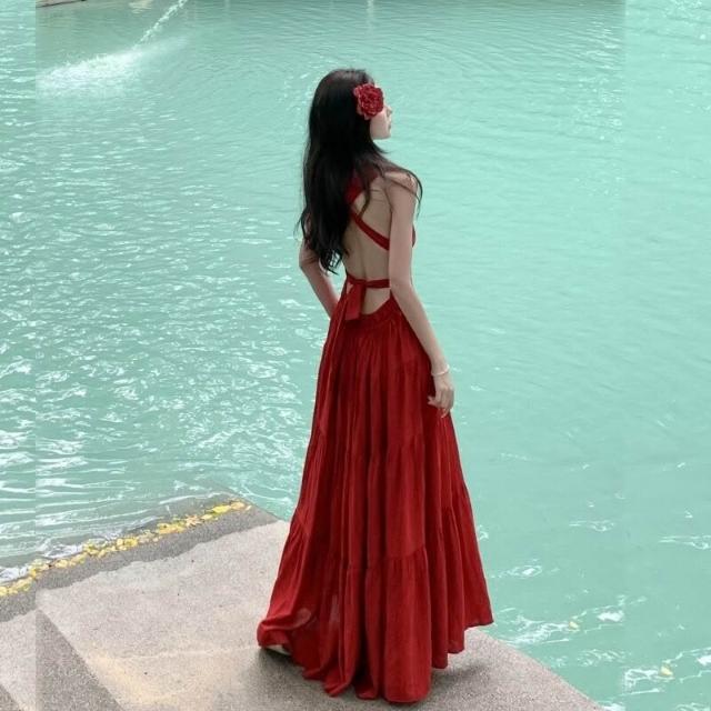 雨墨 三亞海邊拍照衣服超仙紅色吊帶沙灘長裙泰國穿搭度假連衣裙高級感