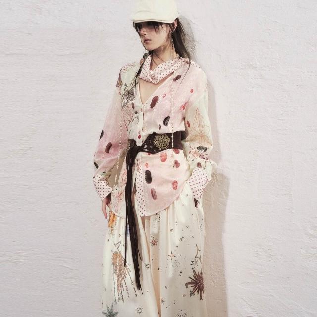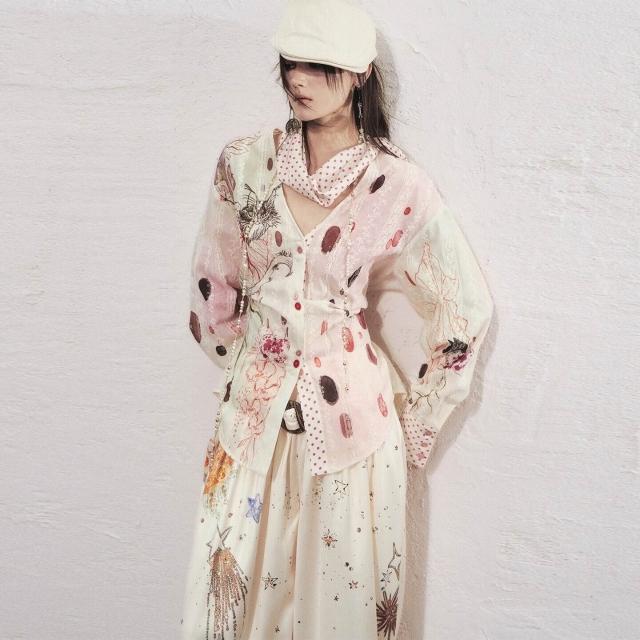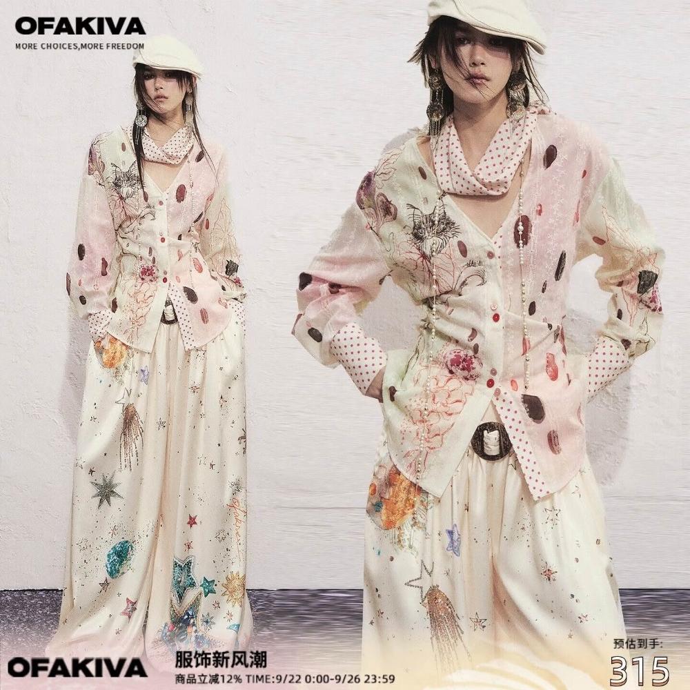 OfAkiva“荷魯斯”手繪水彩貓咪印花襯衫女波點領巾系帶收腰襯衣