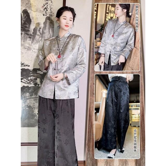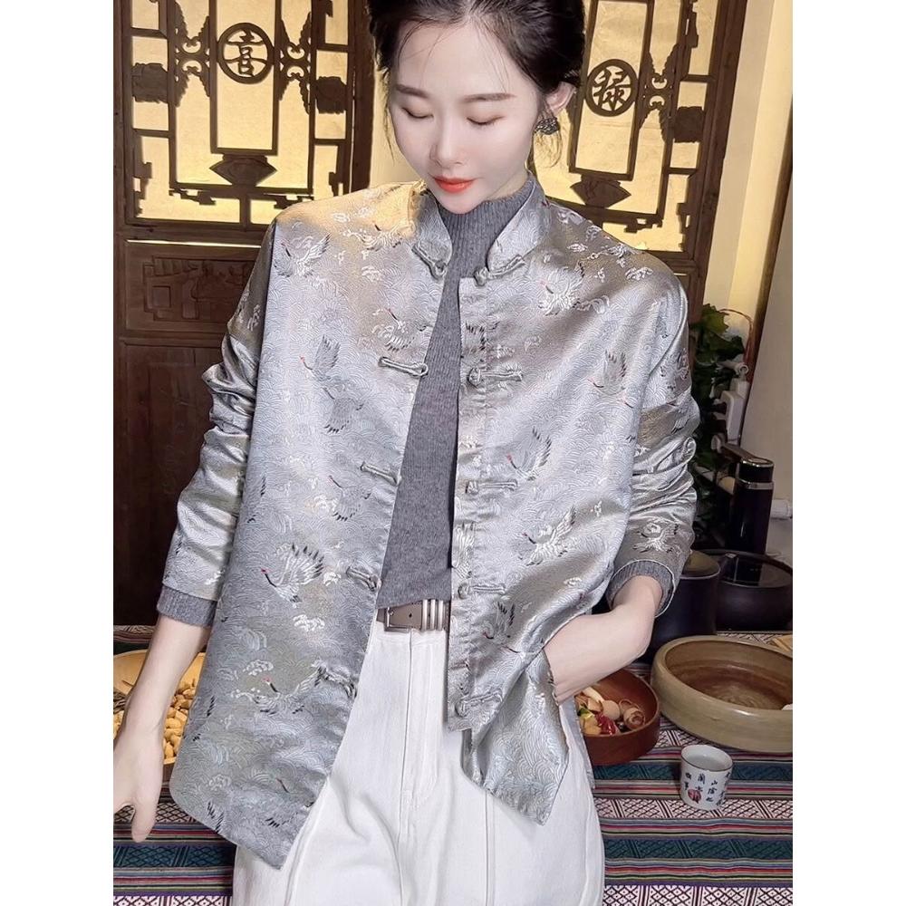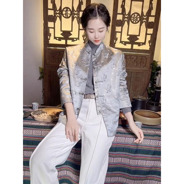旗袍外套新中式桑蠶絲上衣女復古盤扣小立領長袖短款國風外套