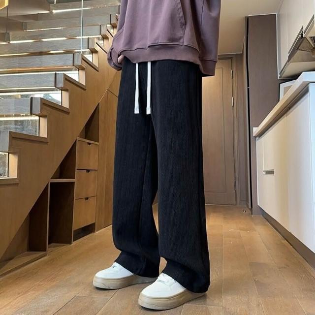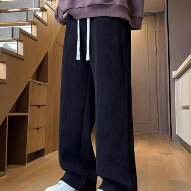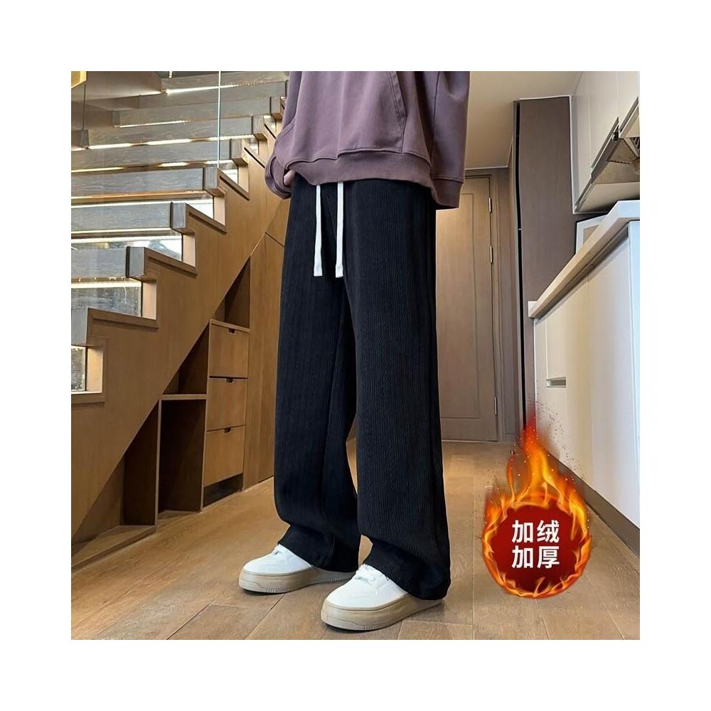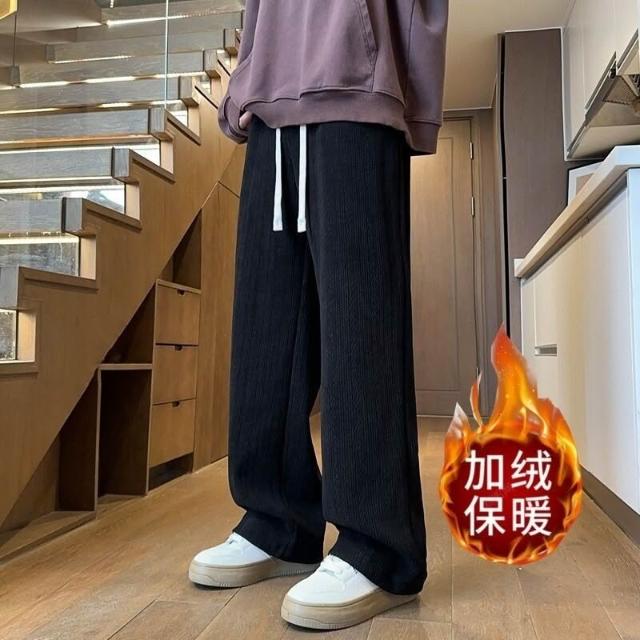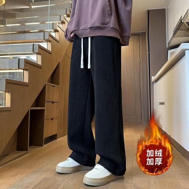 麥穗紋加絨加厚保暖休閑褲男秋冬季寬松直筒闊腿褲子純色直筒