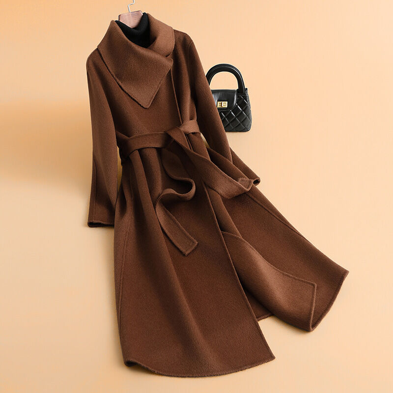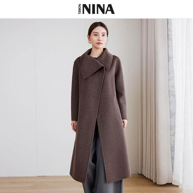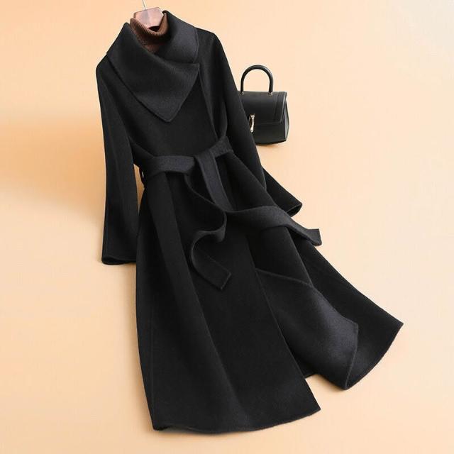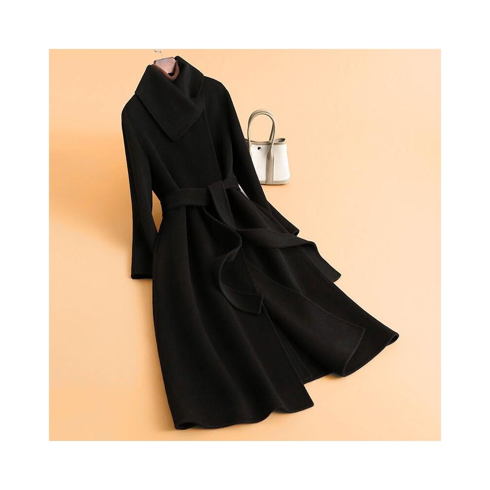 雨墨 秋冬新款赫本風高級感大衣女雙面羊毛大衣黑色收腰毛呢外套女
