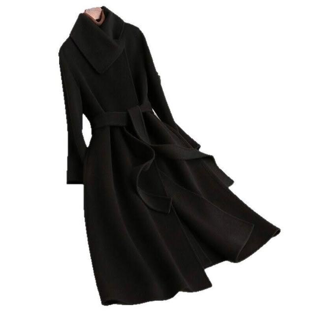 雨墨 秋冬新款赫本風高級感大衣女雙面羊毛大衣黑色收腰毛呢外套女