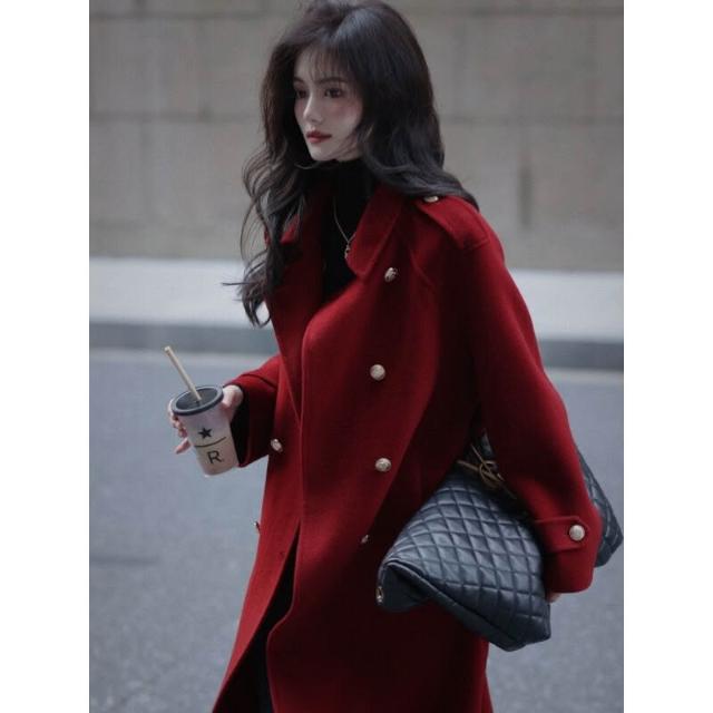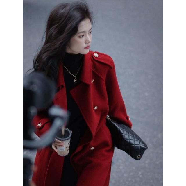 雨墨 .秋冬紅色加厚毛呢外套女長款過膝赫本高個子正肩西裝呢子大衣