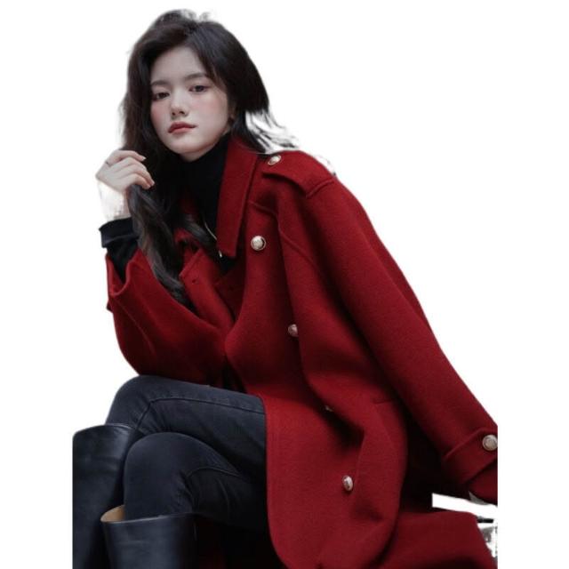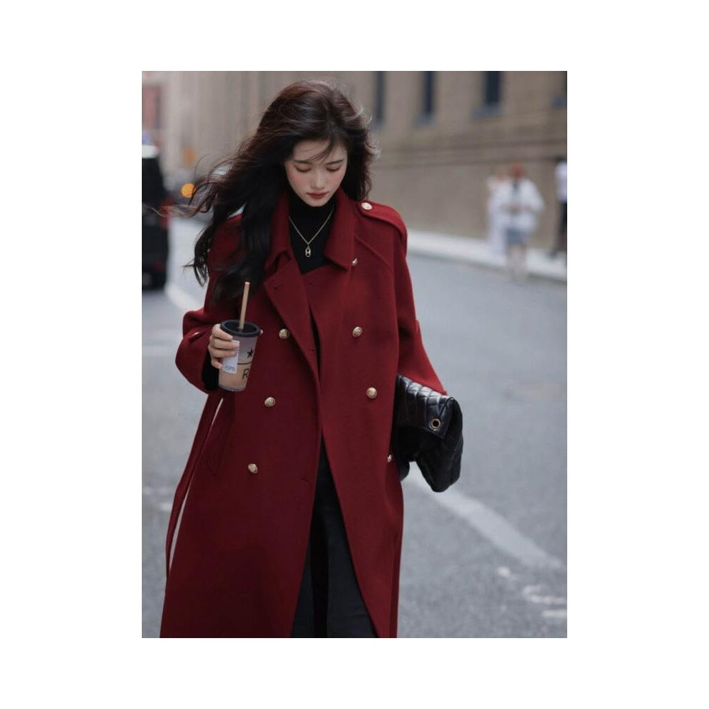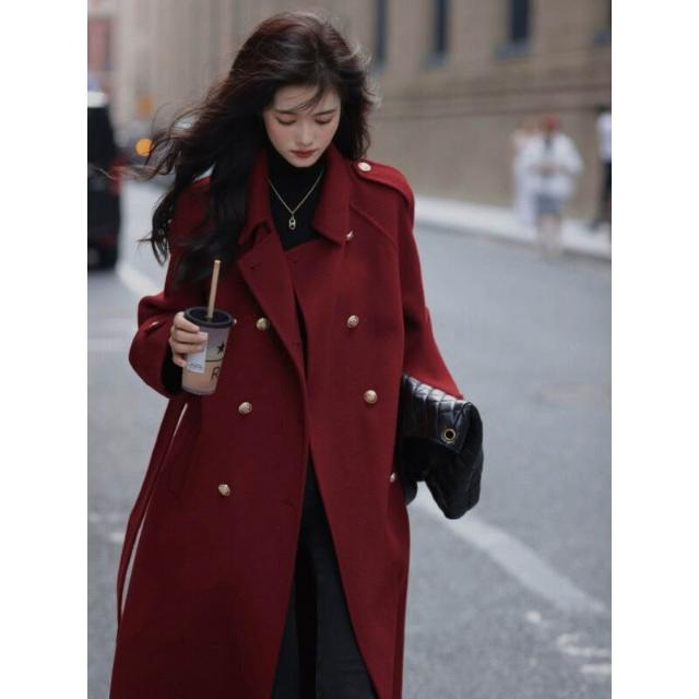 雨墨 .秋冬紅色加厚毛呢外套女長款過膝赫本高個子正肩西裝呢子大衣