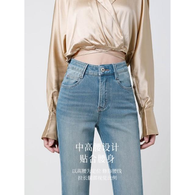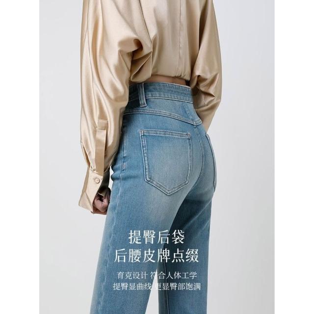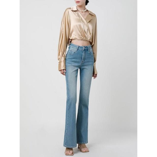 {雨墨} 高腰顯瘦水洗微喇牛仔褲女夏季薄款彈力修身復古淺藍加長喇叭褲子