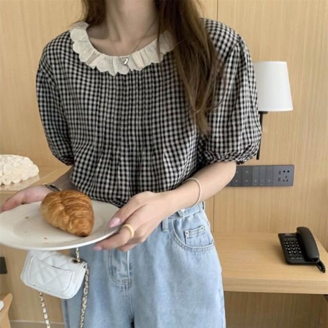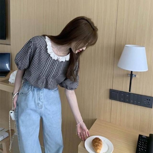 {雨墨} 泡泡袖花邊格子襯衫女夏法式小眾套頭寬松外穿短袖上衣
