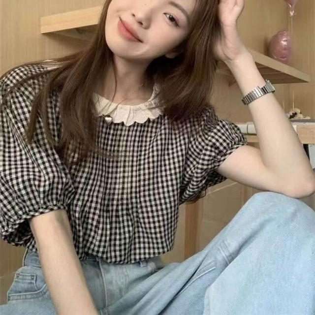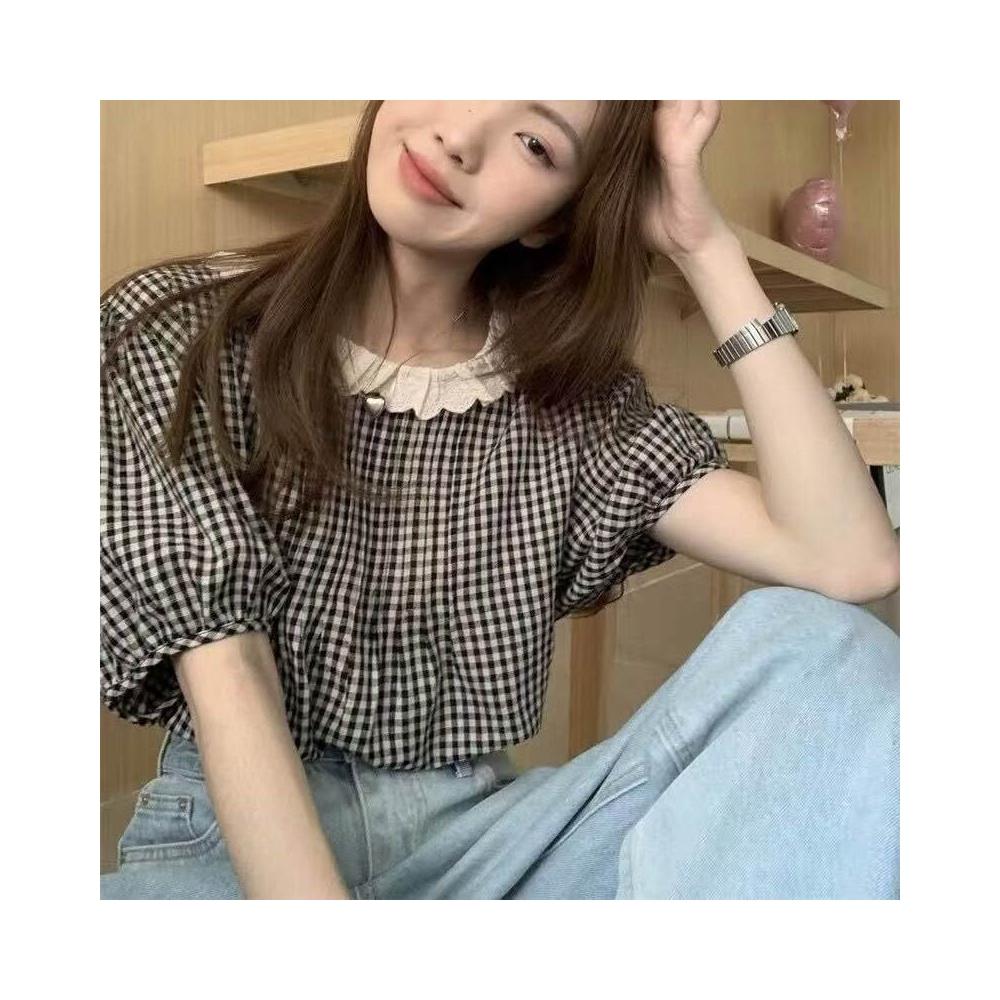 {雨墨} 泡泡袖花邊格子襯衫女夏法式小眾套頭寬松外穿短袖上衣