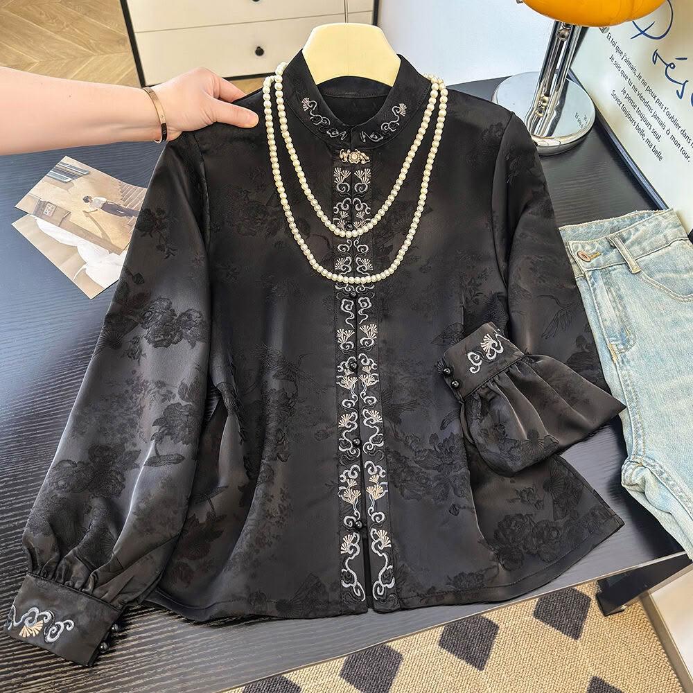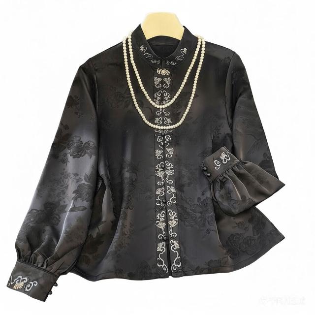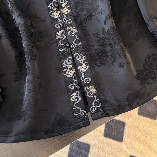 {雨墨} 實拍2026春夏新款新中式國風暗花緞面刺繡高定品質立領襯衣