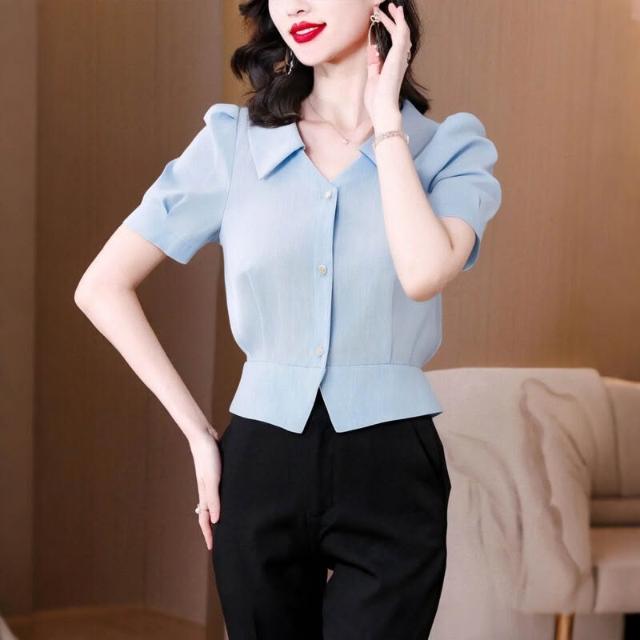 {雨墨} v領純色修身穿搭收腰柔霧藍泡泡袖顯瘦襯衫2026夏季新款優雅減齡