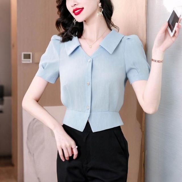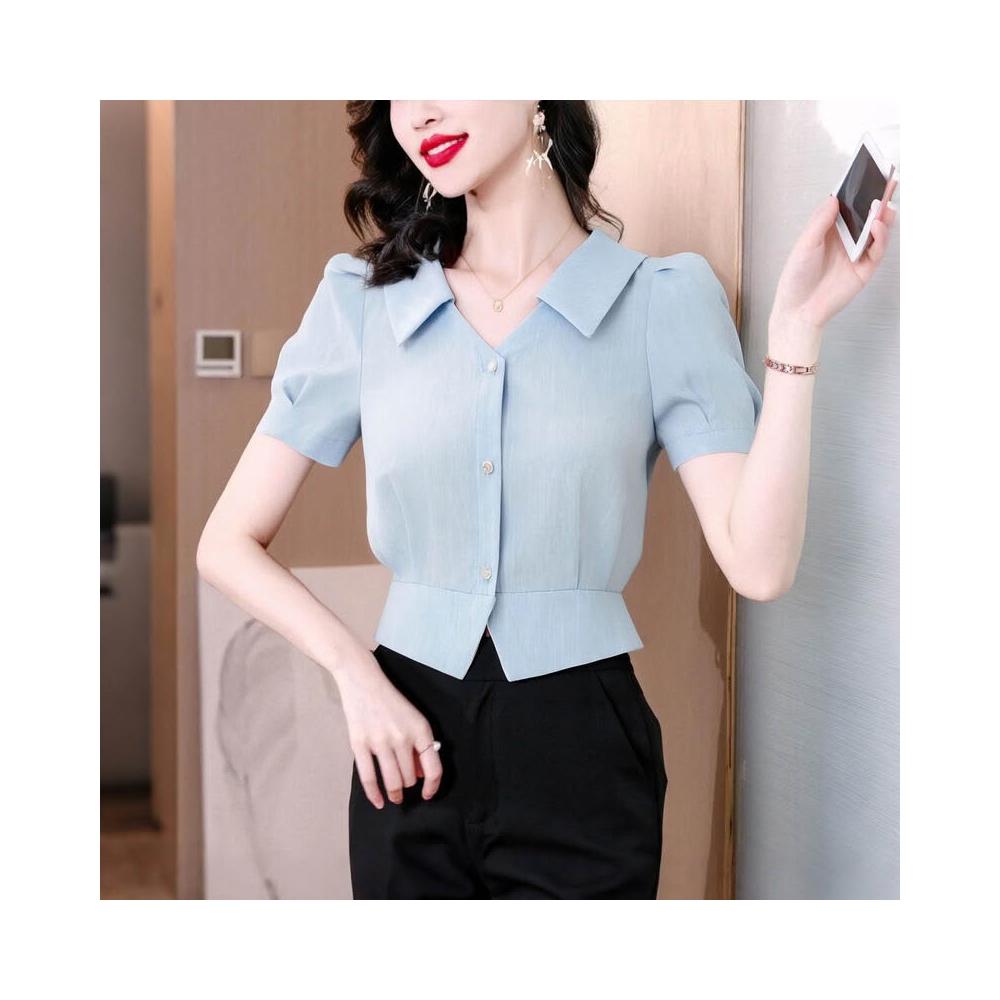{雨墨} v領純色修身穿搭收腰柔霧藍泡泡袖顯瘦襯衫2026夏季新款優雅減齡