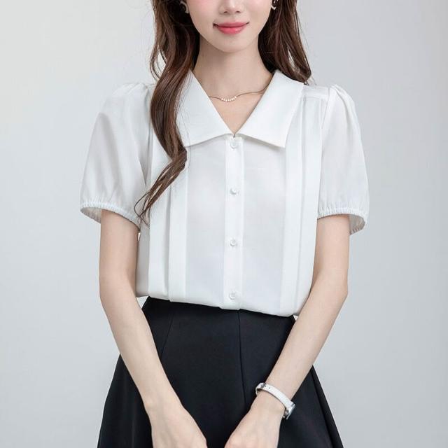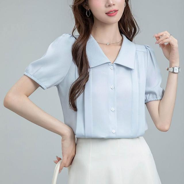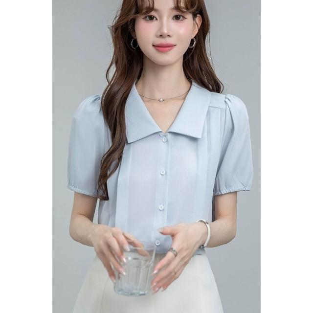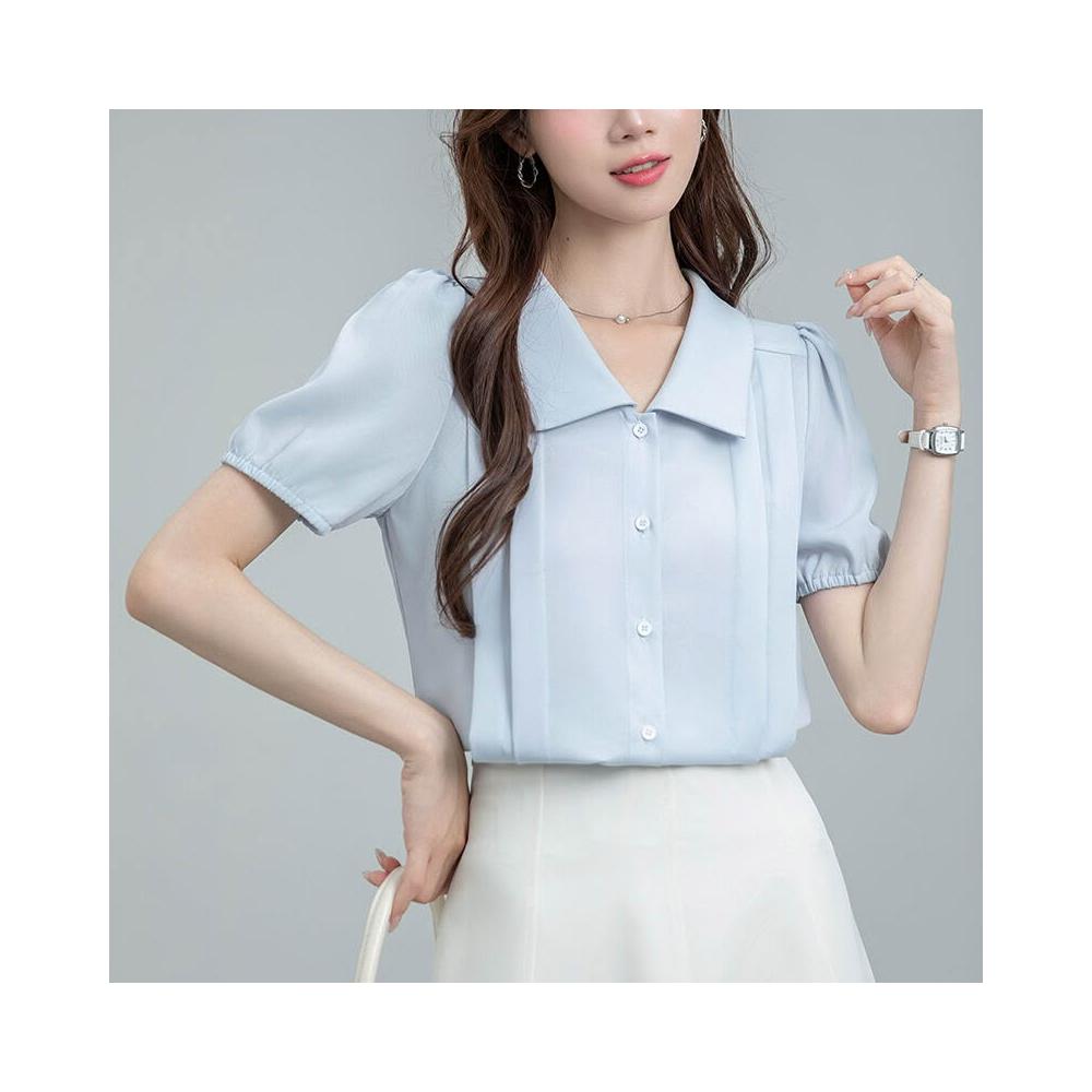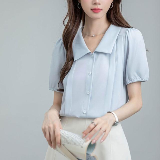 {雨墨} 2026實拍藍色短袖襯衫女夏季法式氣質雪紡上衣面試職業通勤襯衣