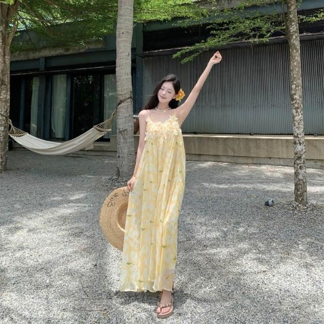 海邊度假黃色印花吊帶連衣裙女2025年新款法式性感夏日絕美小裙子