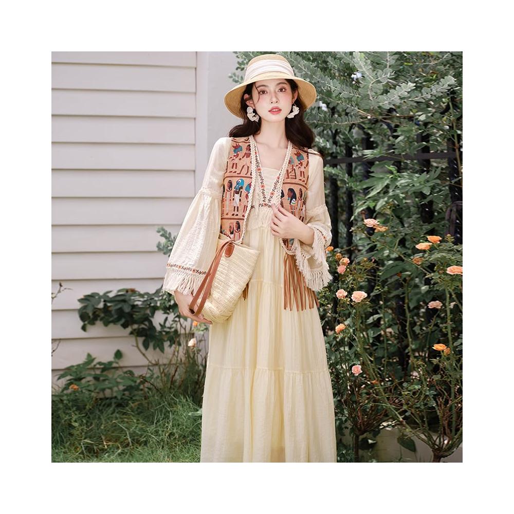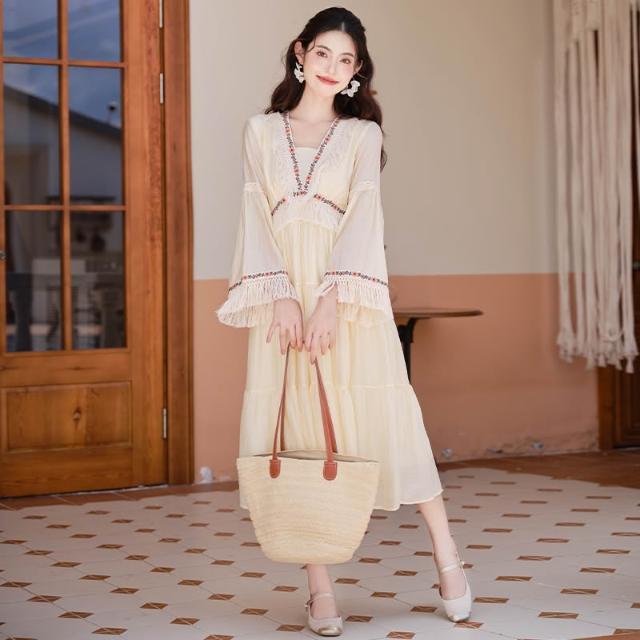 新款實拍 復古喇叭袖流蘇花邊連衣裙海邊度假旅遊沙灘裙+40
