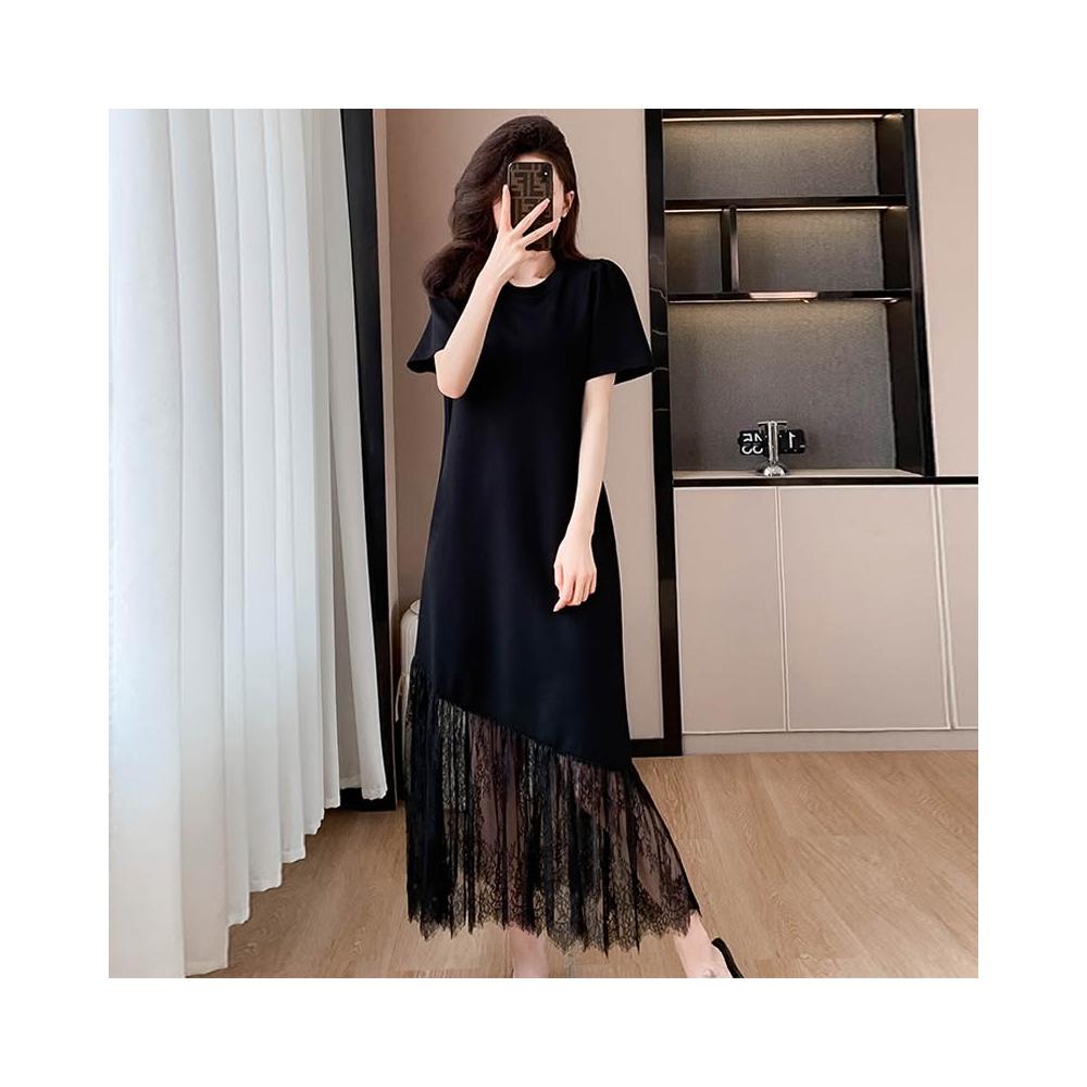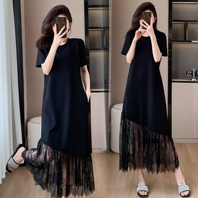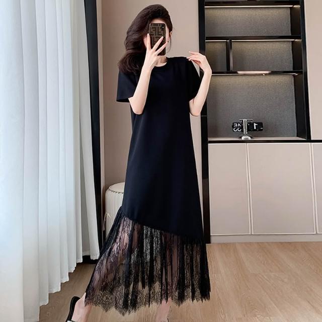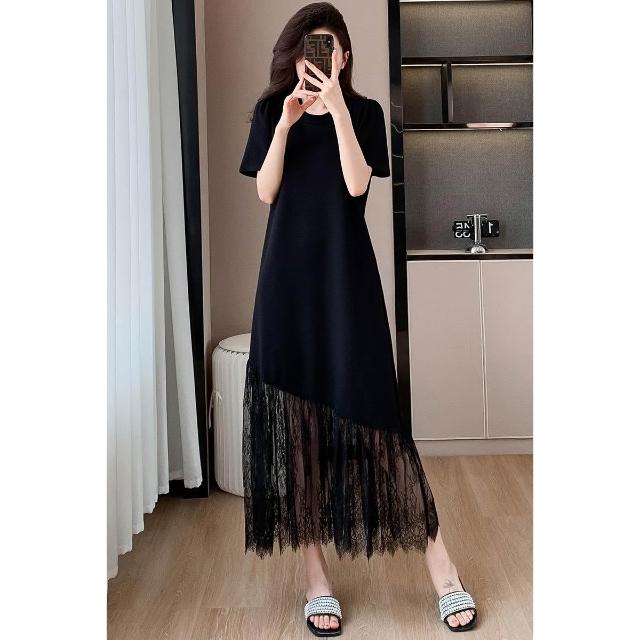 法式高級感蕾絲拼接連衣裙2025夏大碼輕奢氣質減齡顯瘦黑色長裙