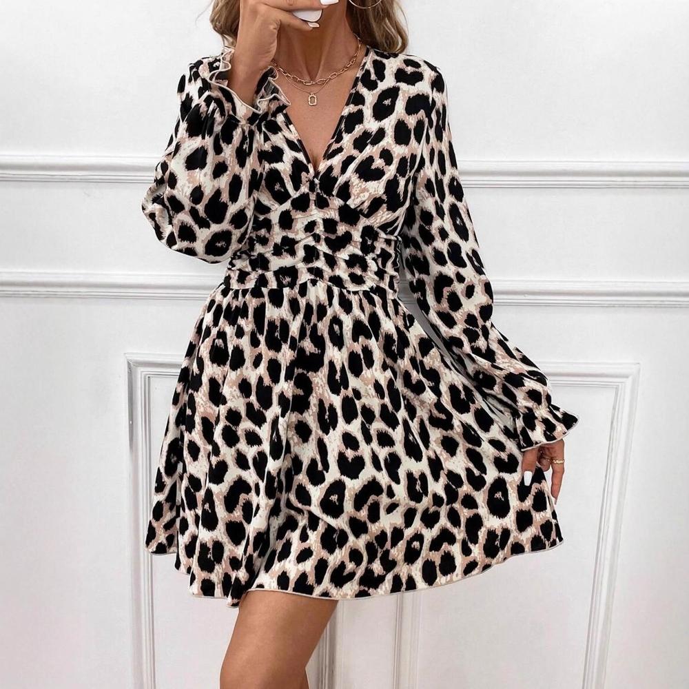 跨境亞馬遜歐美時尚休閑夏季舒適V領長袖防曬豹紋優雅大碼連衣裙