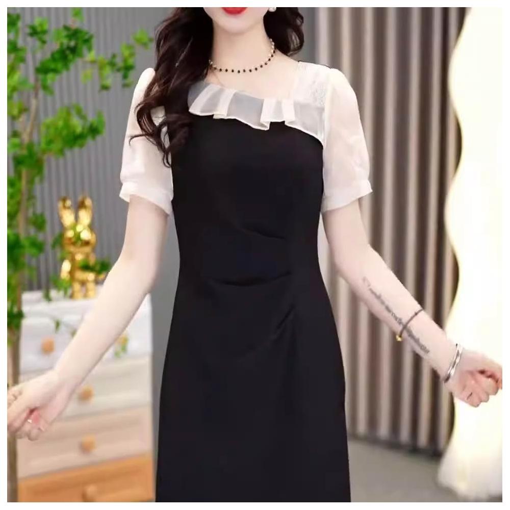 2026年夏季新款氣質碎花拼接小黑裙女韓版收腰顯瘦修身百搭連衣裙