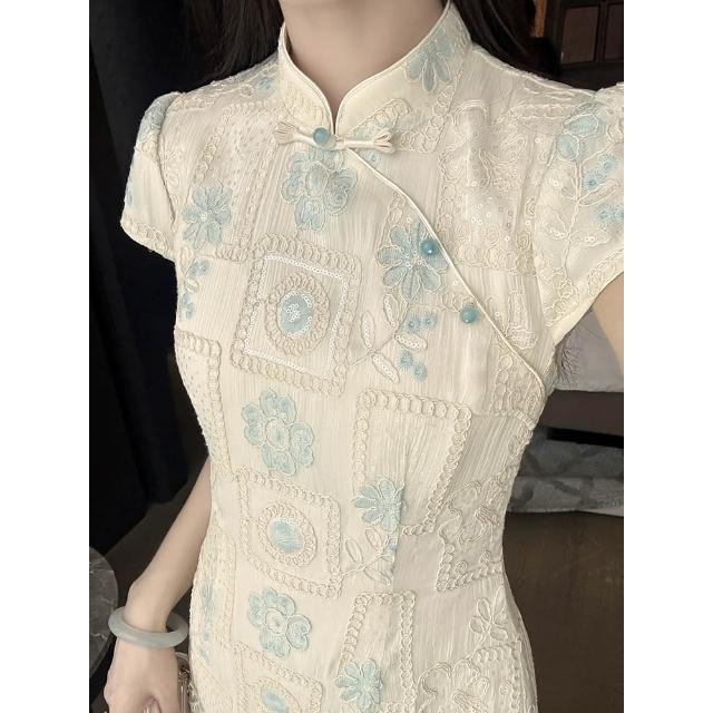 淩茜恣禾白敘詩國風新中式杏色藍繡花拼接裙精致優雅氛圍感旗袍